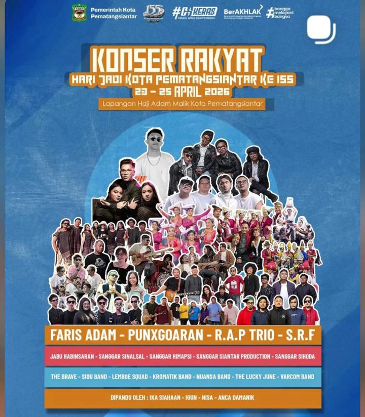 ” Hut Siantar tahun ini, bertajuk semarak Konser Rakyat yang akan di isi Artis ibu kota Faris AdamĀ dan para musisi asal Siantar, ” tutur Olop Sitanggang, salah satu pelaksana kegiatan dari Mora Productions, Kamis (23/4/2026)
